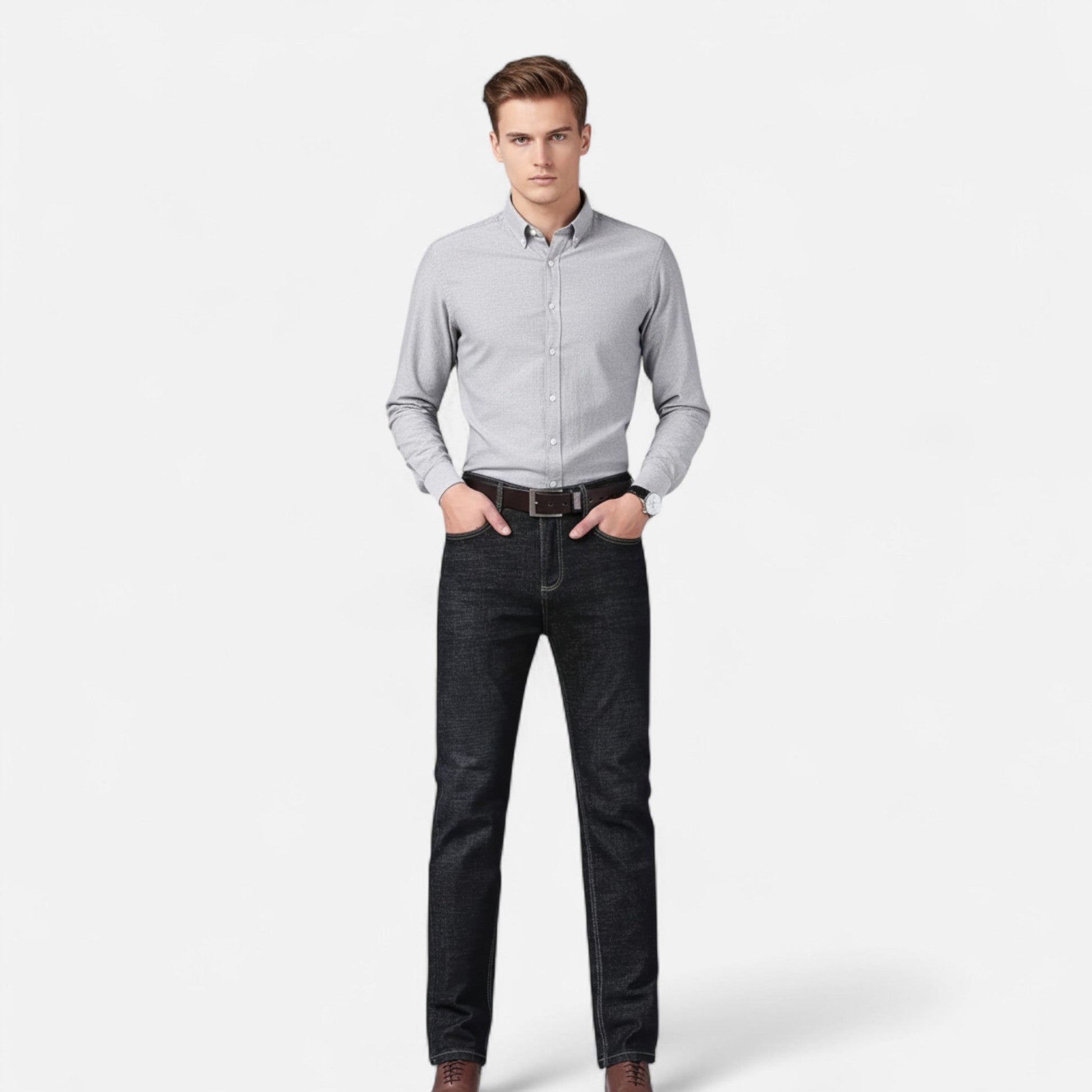 Auvier introduces trousers crafted to blend the polished look of denim with the sophistication of business wear. Designed with a high-waisted, straight-leg cut, they provide a clean silhouette that transitions seamlessly from office meetings to relaxed evenings. Fade-resistant and sleek, they embody understated refinement for the modern gentleman.