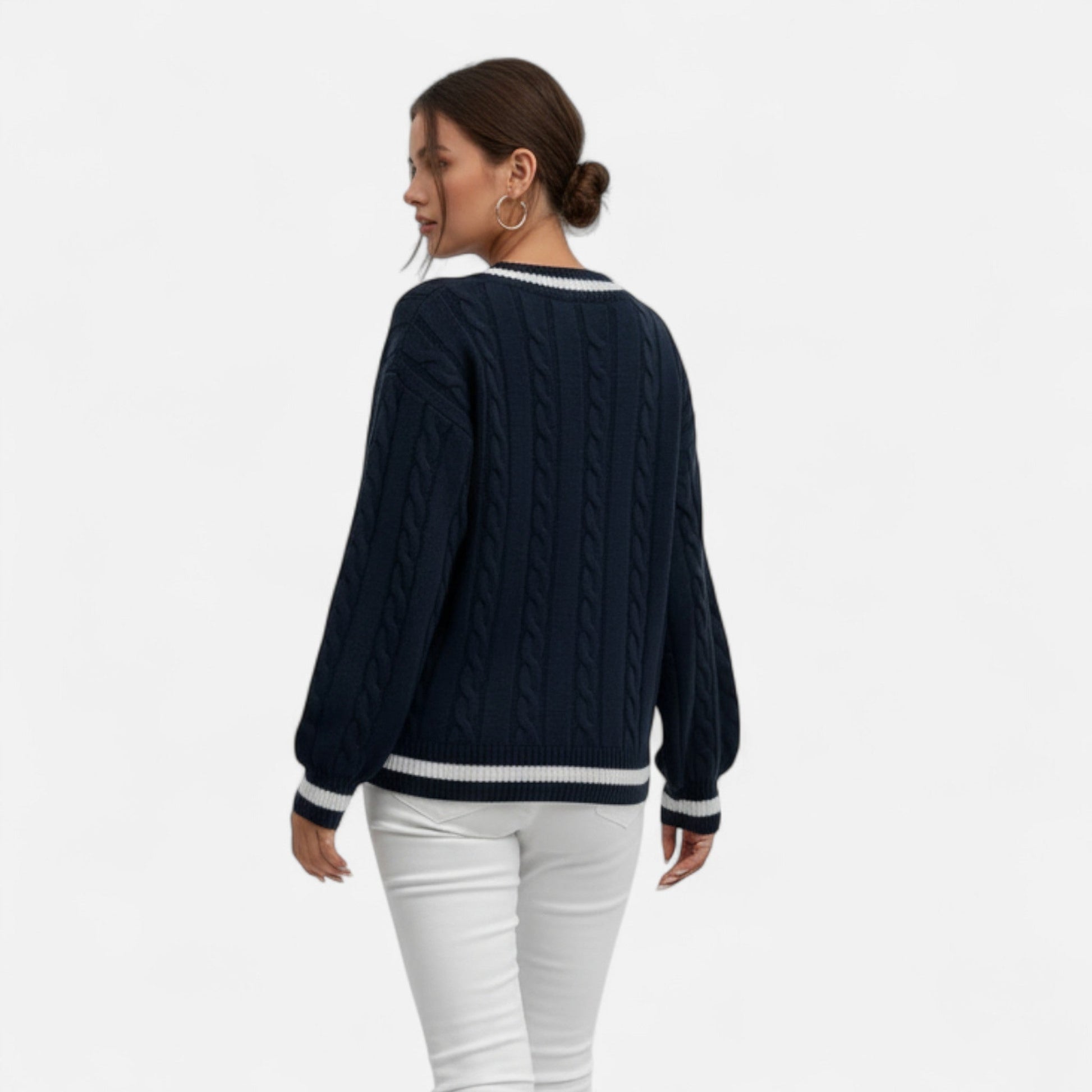 Discover the understated sophistication of Auvier, where classic knitwear is reimagined with refined detail. This colour-block V-neck sweater, enhanced with a subtle twist front, combines timeless design with modern ease. Its drop-shoulder silhouette and loose fit create a relaxed elegance, making it a versatile choice for both casual moments and elevated gatherings.