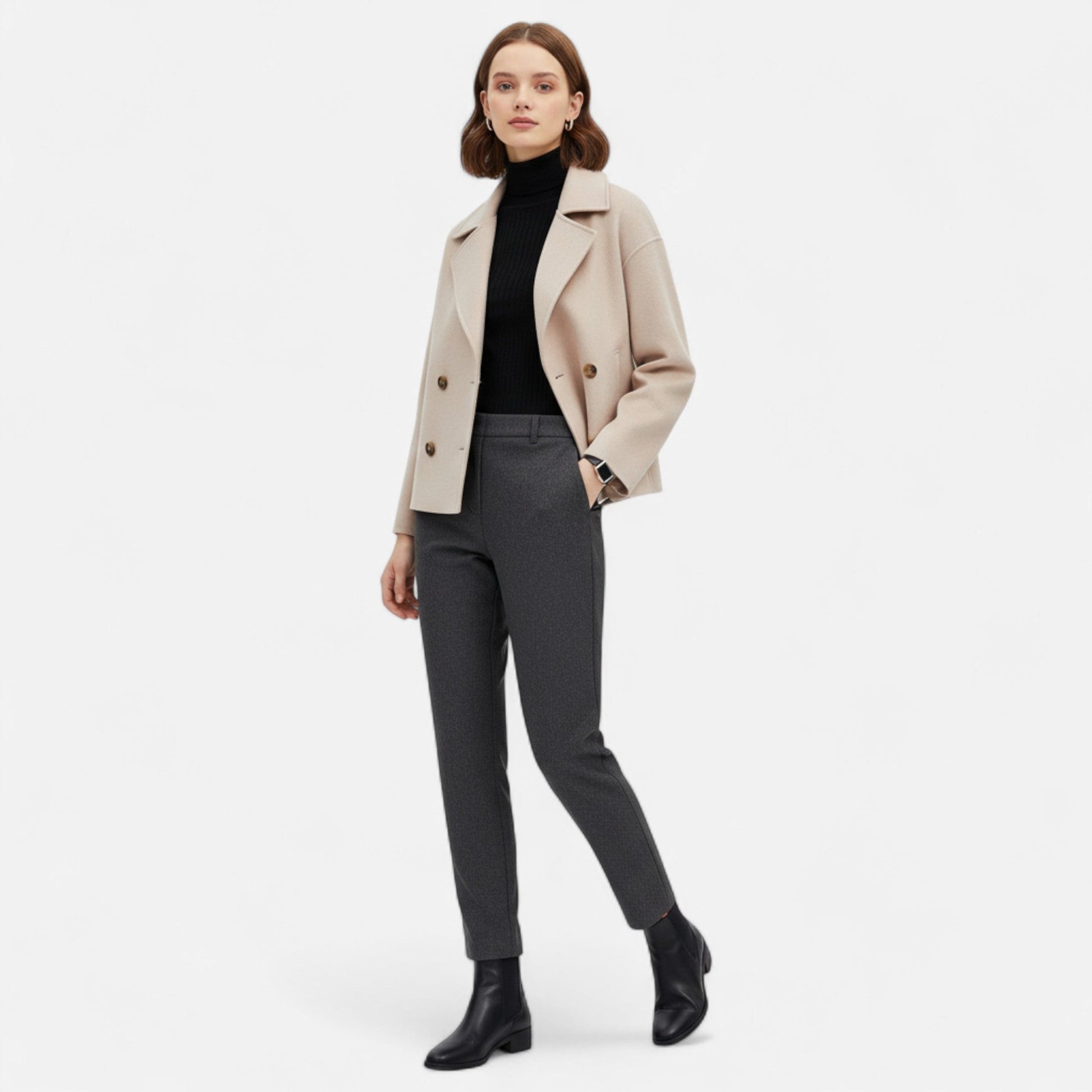 Your coat combines structure and sophistication in equal measure. The double row of buttons enhances its tailored look, while the comfortable fit ensures wearability throughout the day. A piece that seamlessly transitions from casual outings to evening gatherings, embodying both grace and practicality.